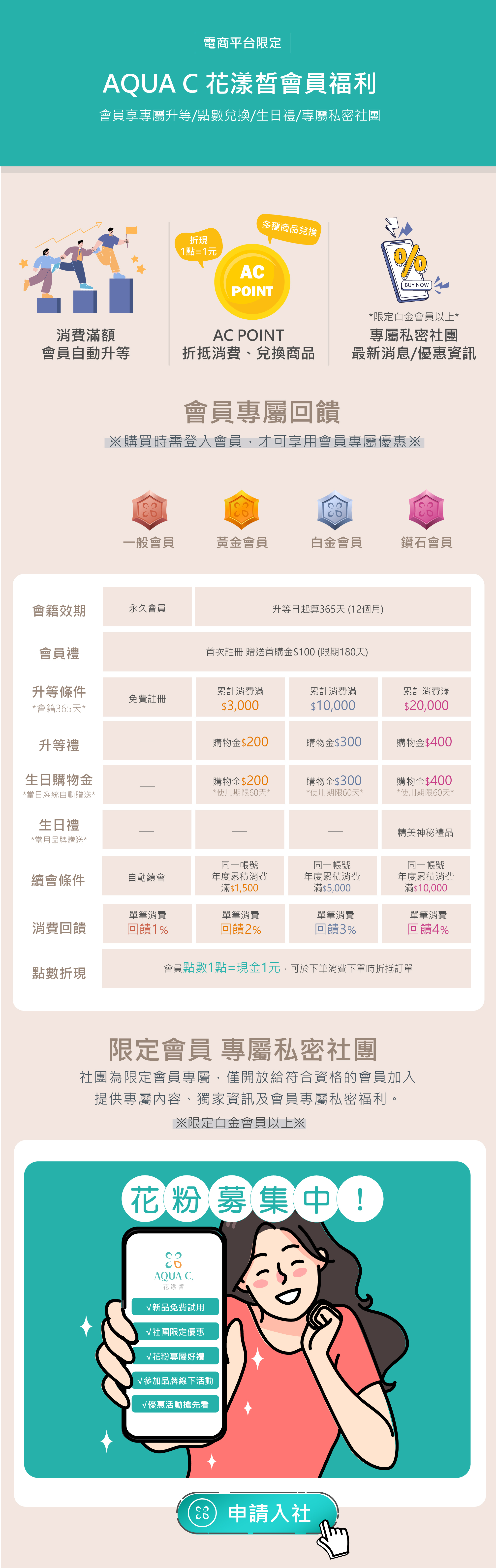 ◎會員購物金實際生效日期以AQUA C 花漾皙官方電商系統紀錄為準,會員資格有效期限內皆可使用。(註:於2025/1/1完成註冊之會員,其會員帳戶內購物金,有效期限以一年為限。)