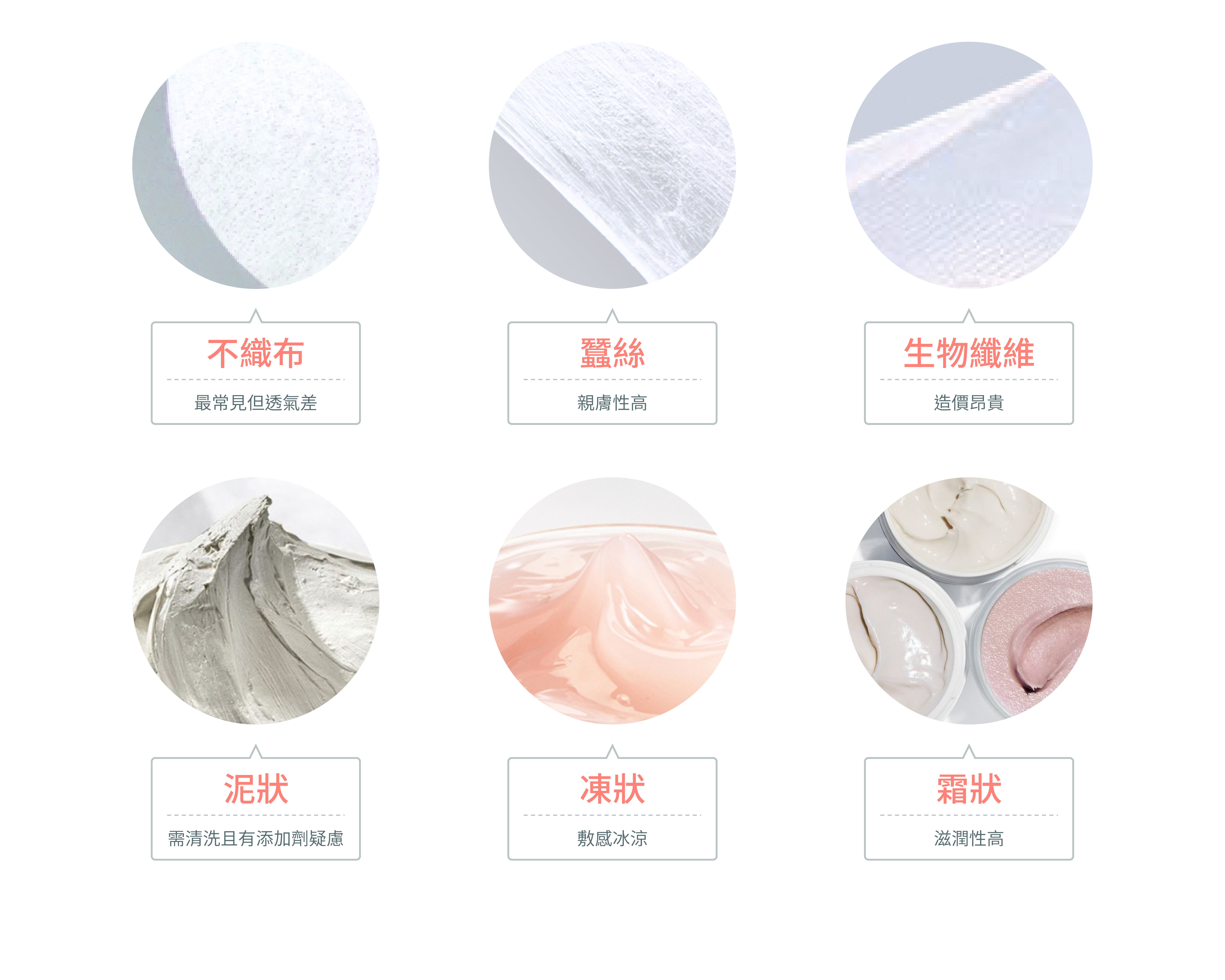 市面上比較常見的面膜分為片狀和塗抹式兩種,片狀面膜依照布膜的材質主要以不織布、蠶絲或生物纖維較為常見;塗抹式面膜則以泥狀、霜狀、凍狀面膜比較多。