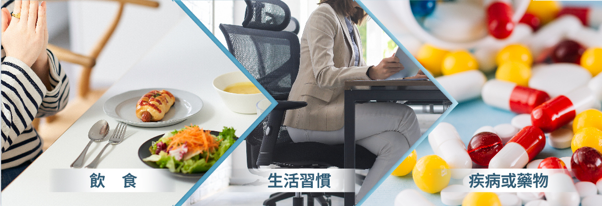 造成便秘的原因大致可分類為三個面向,分別為飲食、生活習慣及疾病藥物所導致的狀況。