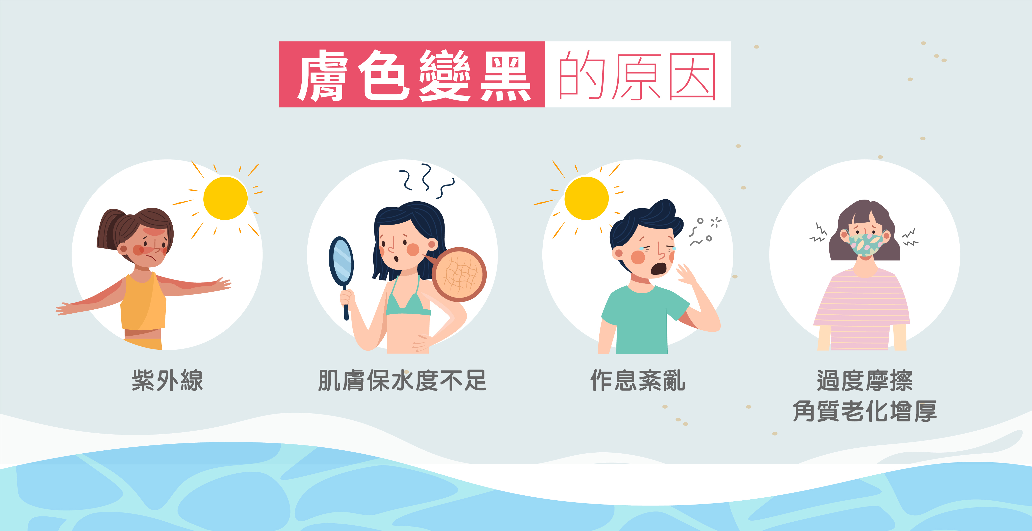 📍 紫外線:當黑色素細胞受到紫外線刺激時,會大量分泌生成黑色素,如果不注意防曬,長期將皮膚暴露在紫外線之下,就可能造成暗沉和色斑、造成膚色不均。