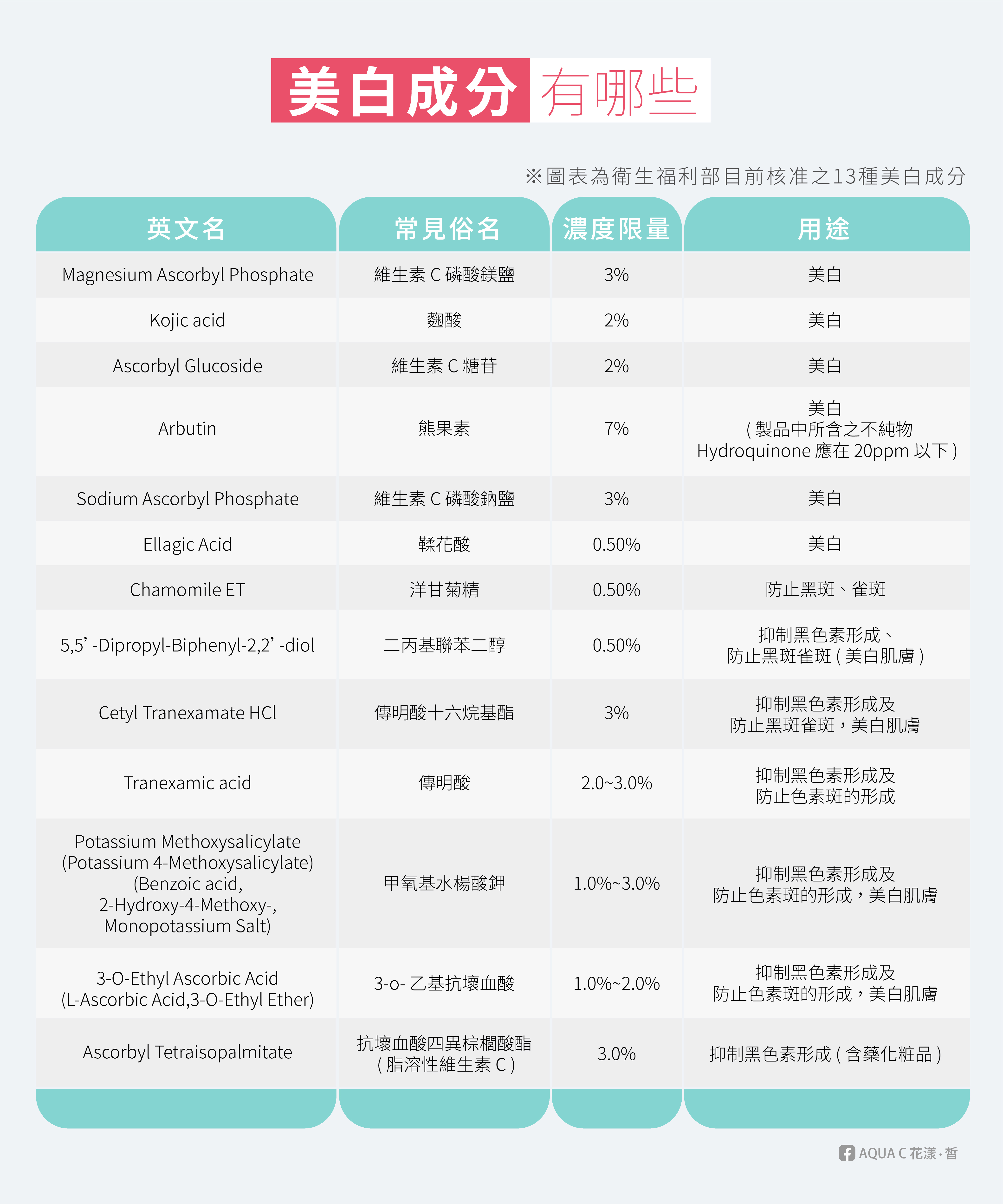 目前衛生福利部核准使用的 13 種美白成分,主要功能分為「抑制黑色素形成」及「淡化及代謝黑色素」兩大類,若美白產品含有核定的成分,再搭配抗氧化成分,以及完整的防曬步驟,就能有效達到阻黑亮白的效果。